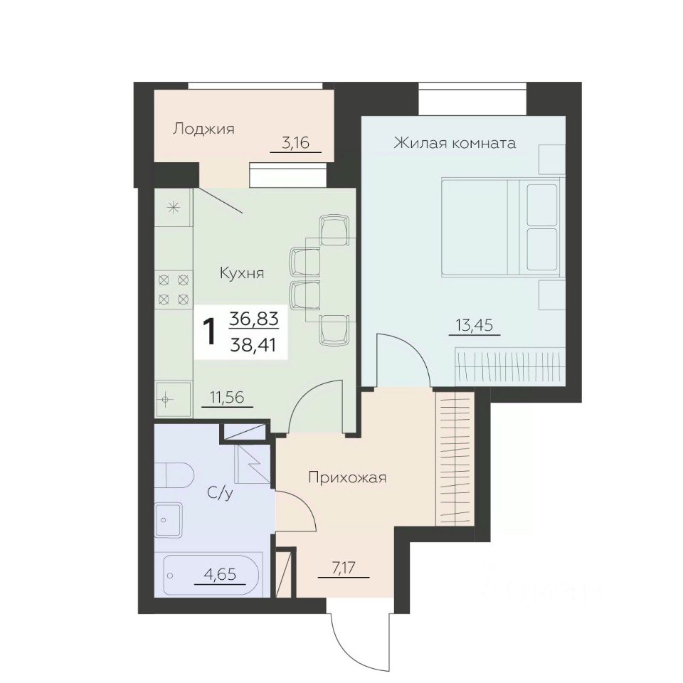 Общая площадь38,41 м2