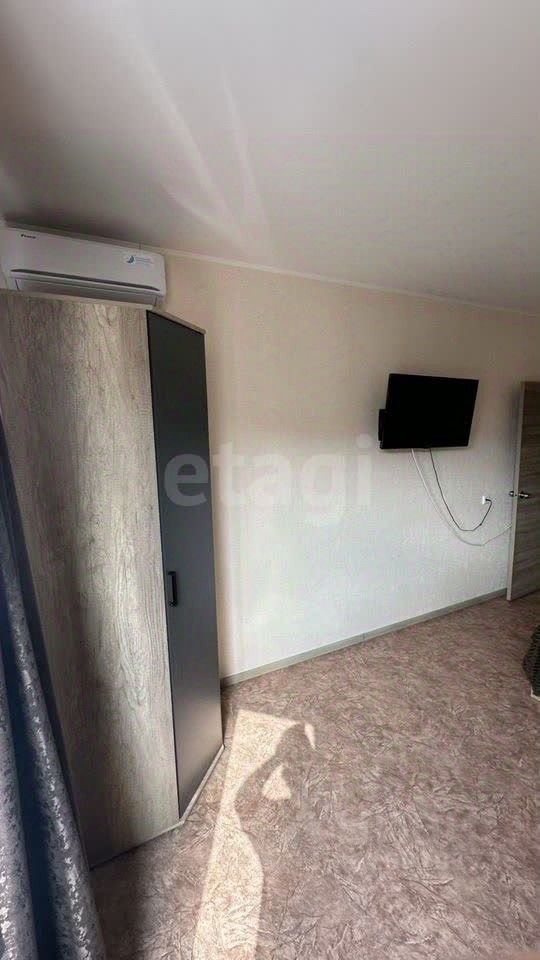 В квартире имеется просторная жилая комната, в которой установлены необходимая мебель и техника для комфортного проживания: кондиционер, телевизор, кровать, шкаф, журнальный столик.