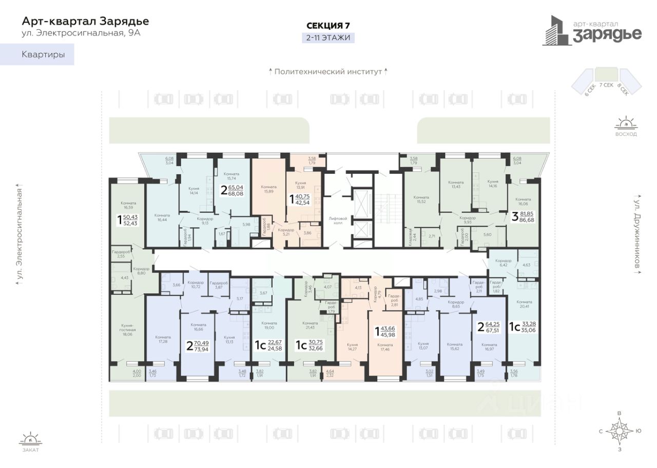 Арт-квартал ''Зарядье'' - это новый микрорайон, который расположен на пересечении улиц Электросигнальной и Дружинников, в 5 минутах ходьбы от остановки Политехнический институт. Арт-квартал возводится в тихой части Коминтерновского района рядом с крупнейшей городской артерией - Московский проспект. Благодаря своему удачному расположению путь до центра города займет всего 10 минут. Помимо транспортной доступности в районе активно развита инфраструктура.