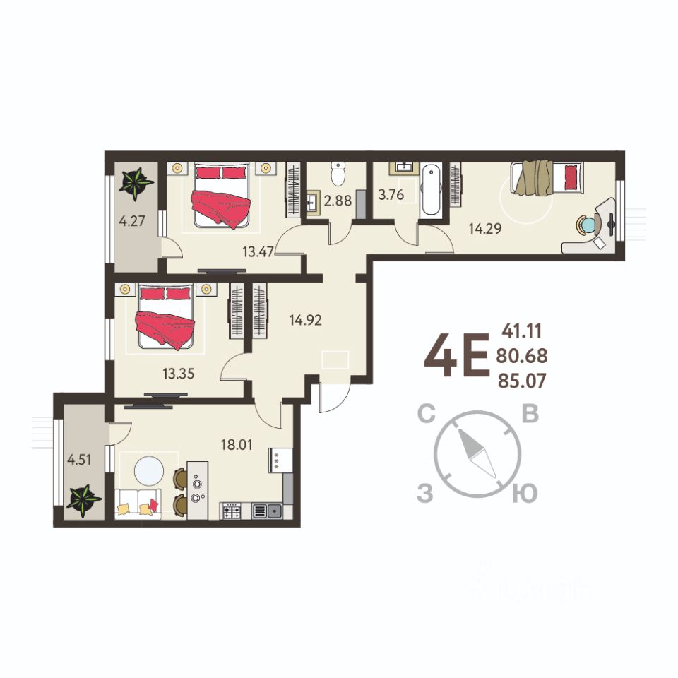 Общая площадь85,07 м2