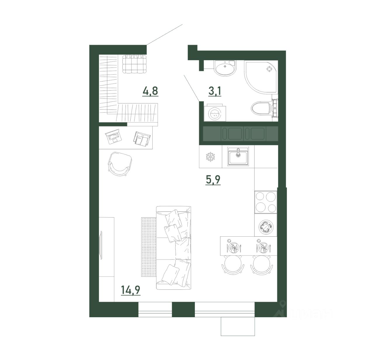 Жилая площадь14,9 м2